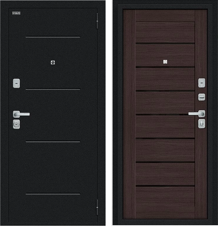 Надежная входная Дверь Браво Техно/BChrome Букле черное/Wenge Melinga премиум класса по цене 34 507 руб. Большая толщина стали защитит от проникновения в ваш дом, квартиру или коттедж. Используется очень качественная фурнитура: замки, цилиндры, ручки, защелки. Покрытие и отделка двери изготовлено под внимательным контролем производителя. Дверь имеет долгий срок службы и гарантию.